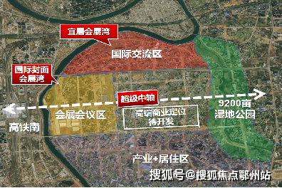 会展会议区、国际交流区、 产业居住区、高端商务核心区、9200亩画田苑湿地公园