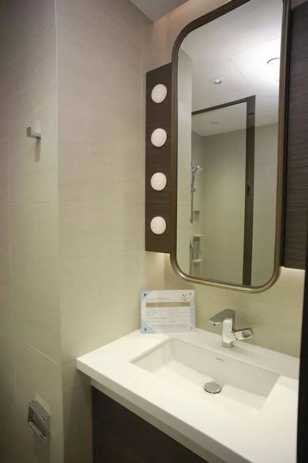 浴室方面,镜柜的设计采用了丰富的木质色调,配上犹如相框的镜子,再加上脸部照明设计,顿时化身为剧场化妆室,提供不一样的淋浴体验。