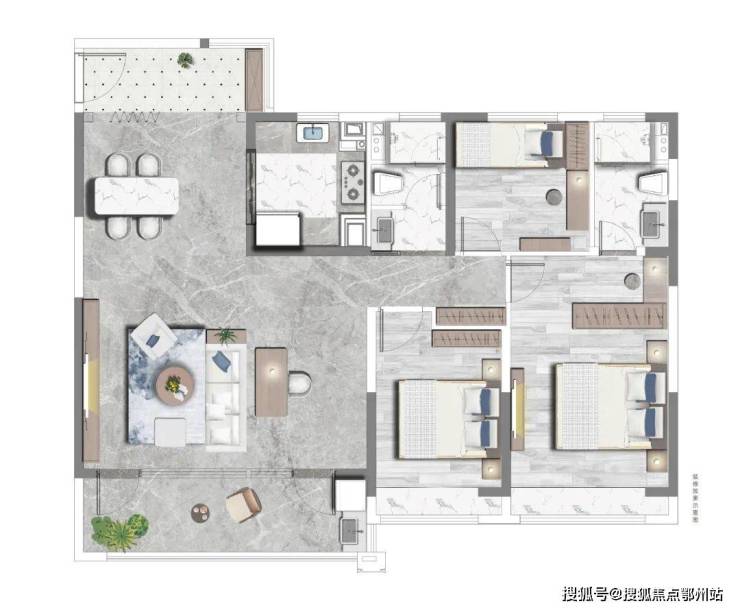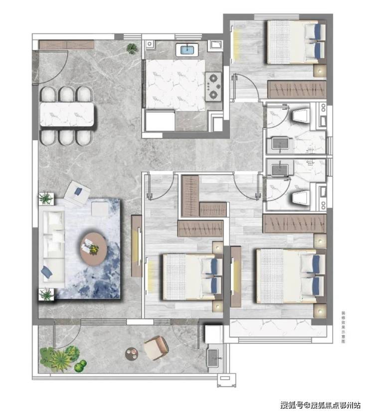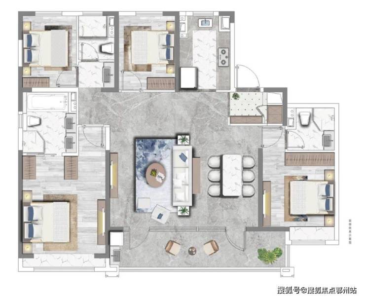 户型点评:同样是4房3卫的设计,做了餐厅+客厅的横厅设计。双卧室套房,私密性比较高。主卧设计了步入式衣帽间。