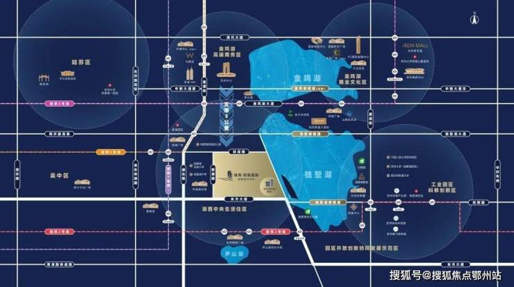 ①与苏州工业园区相连的双湖版块,呈现了苏州现代化和国际化的一面,地标建筑东方之门、苏州中心、W酒店等林立,是苏州比较公认的高端住区之一,北有金鸡湖,南有独墅湖,西侧是姑苏古城和吴中城中心。