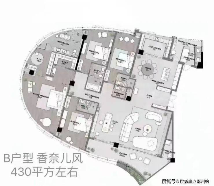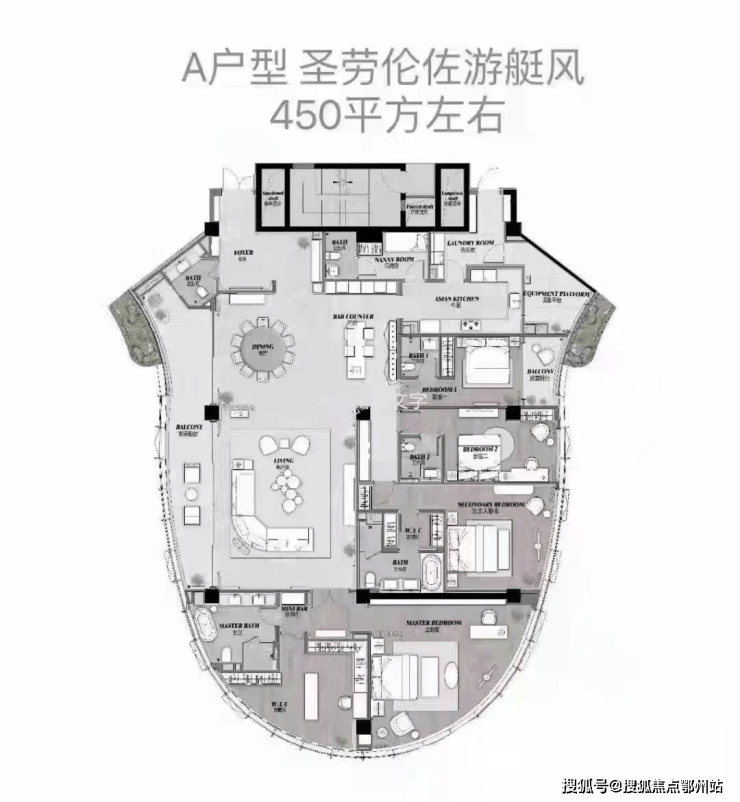 户型面积430-450平方米的面积,售价1550w起,精装修,得房率超高82%,自带环形大阳台,