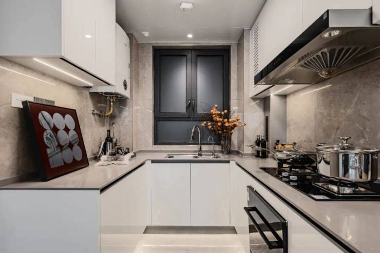 厨房使用科勒(或同等品牌)厨盆、厨盆龙头, 使用起来更加方便;更有定制橱柜、石英石台面,美观耐用的同时也方便日常清洗。厨房墙砖、地砖、吊顶都是统一色调,非常美观。