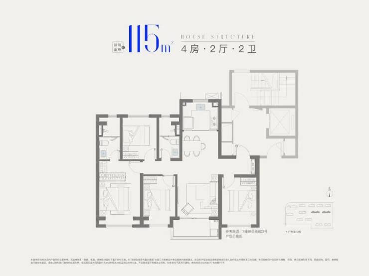 建面约115㎡4房2厅2卫,做到了 四开间朝南+全卧室带飘窗+主卧套房设计 ,一步到位的大四房户型。兼顾大4房的功能性和空间尺度,非常难得,更适合四口之家或三代同堂家庭居住。