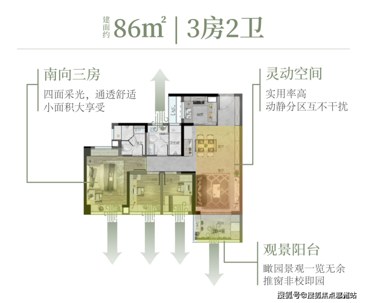 85㎡的3房, 虽然是低总价的上车小户型,依然做到了大面宽、全南向设计,再加上极致的赠送面积和超大的收纳空间,应该能俘获不少年轻人的心。