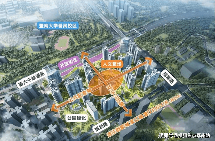“十字绣带”双轴交汇处形成“人文环”,享受大学城里文艺版本的“广粤天地”,打造宽面屏公园路演空间、城市艺术Lab剧场、商业街区和文艺草坪等相互融合的“人文聚场”。