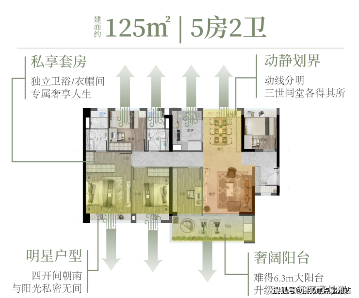 125㎡的5房 面宽超过14米,加上6.3米的大阳台,采光通风能力无敌。小家化的主卧和适老化的次卧都非常宽敞,更适合有进阶居住需求的多口之家或刚改客选择。