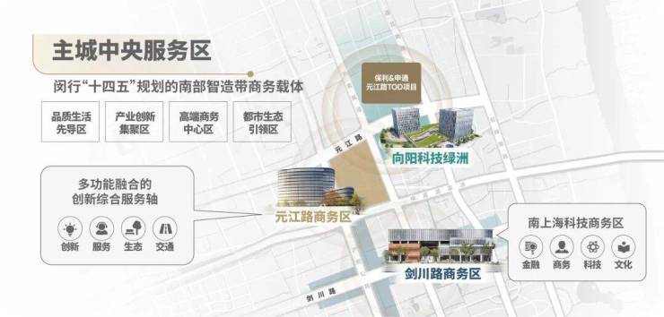 藉由上海南部科创中心与15号线智创聚集建设,依托“3+6+9”闵行TOD示范区和“十四五”双战略及品牌开发商高起点的人居营造,元江片区成为主城科创重策地,汇聚3大国家级产业区、5大科创中心、12大科创园、3000+企业,未来将以科创产业为引擎,入驻100+五百强企业,引进80万全球高智人才,筑就创新、人文、生态高度融合的中央服务区。