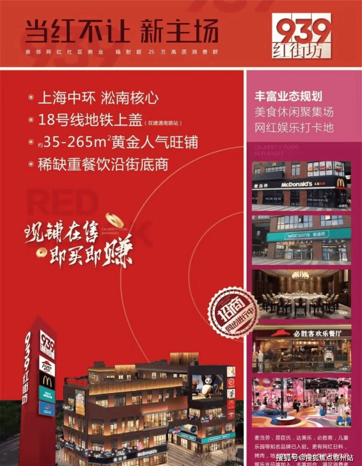 上坤939红街坊商业售楼处电话:400-112-0302【售楼中心】上坤939红街坊商业项目位于宝山区,地铁上盖,35-265㎡重餐饮商铺,18套房源,月租金收益高,地段优越,交通便利,是区域地标性商业项目。