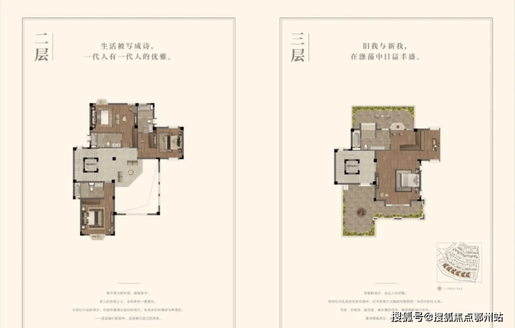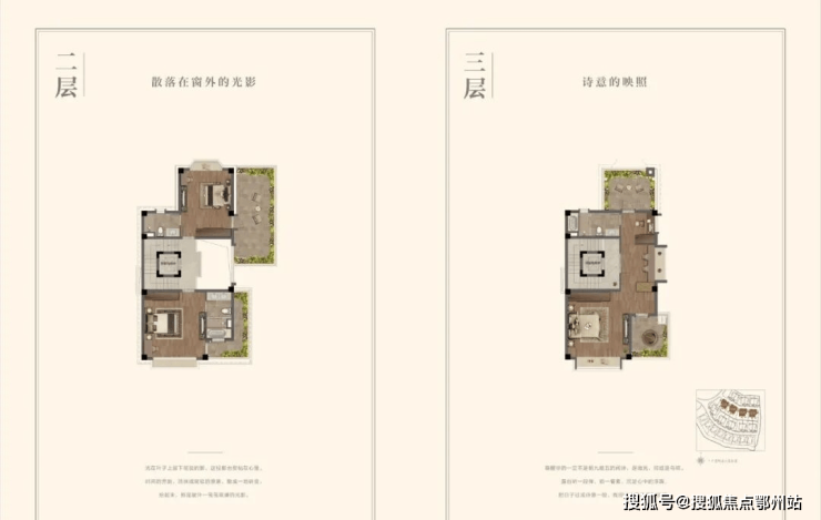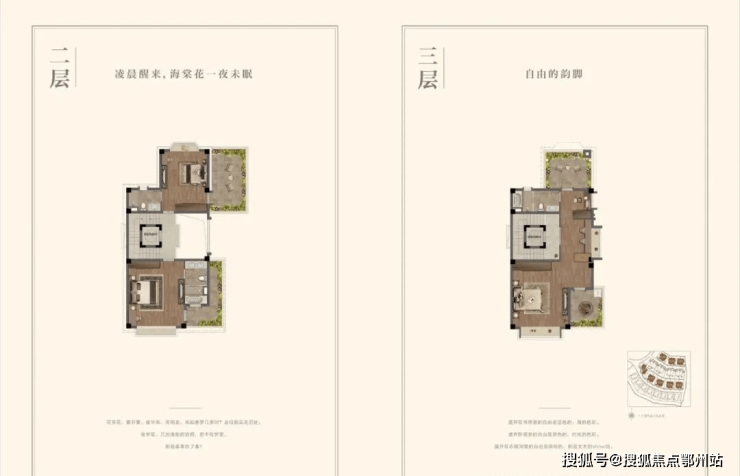 二楼:带有2个卧室,北卧室连接北向超大露台,南卧室带有独立的阳台。三层是一个超级豪华的套房,带有小书房设计,更有南北2个露台;