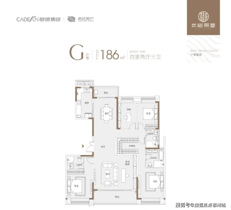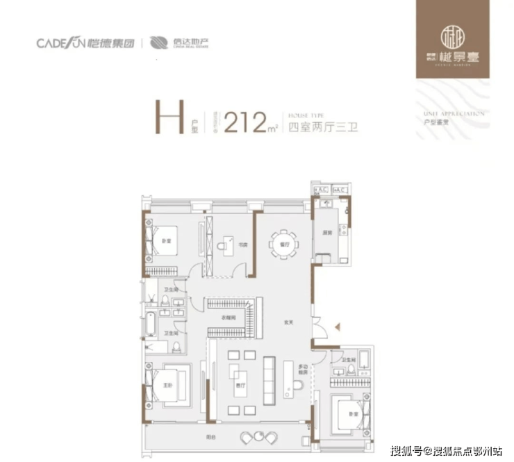 优势:户型方正,空间利用率高;双阳台设计兼顾观景与实用;主卧套房配置独立卫浴,次卧分布均衡;适合三代同堂或二孩家庭,兼顾舒适性与功能性。