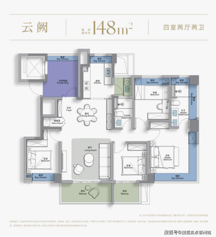 而建面约148㎡“云阙”户型,则是西派云间立下的 “改善旗舰” 。它集四大创新于一身:四开间朝南、三阳台功能分区、边套270°环景飘窗、一梯一户阳光梯厅。其LDKB一体化空间形成了约34㎡的超大会客厅,搭配约3.05米的层高,空间气场直逼大平层。边套主卧的270°环景飘窗,采用造价更高的大尺寸玻璃,将视野与采光最大化,晨起赏朝阳、夜晚观繁星成为日常。从入户开始的墅级收纳系统,到功能分明、动线高效的U型厨房,再到兼具衣帽间和全明主卫的“全景休憩舱”式主卧,每一个细节都在诠释何为“奢宅尺度”。