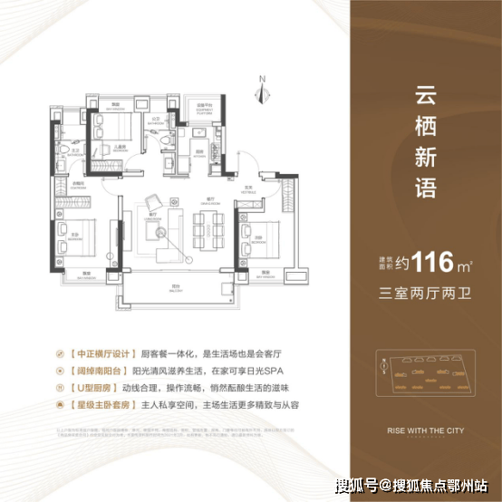 整体来看,116m²亮点颇多。U型厨房,抽拉式水龙头,西门子厨具,洗切烹动线流畅;独立玄关入户,家庭公区收展一体化;北侧全飘窗设计,公卫干湿分离,主卧套间, 宽景阳台面宽约5米8,进深约1米8