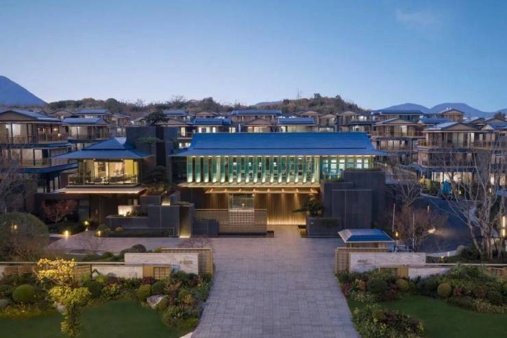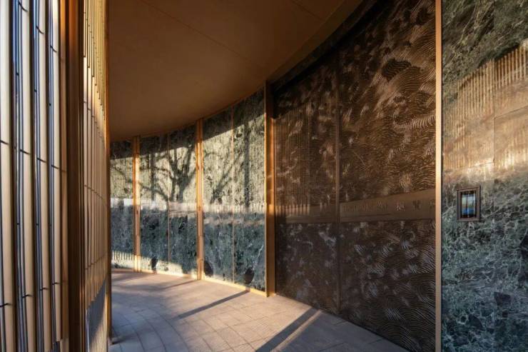 穿庭而过,闲雅静逸,飞檐、斗拱、引檐、直棂窗等宋代建筑细节,融揉现代审美工艺,重塑东方的当代表达 ;巨幕灰蓝色玻璃,让建筑隐于自然,呈映天光云影。 “石青、靛蓝、天目釉、淡金、灰玻”宋韵五色体系, 以现代笔法勾勒风骨,于光影流转的序列中,藏纳天地章法 。