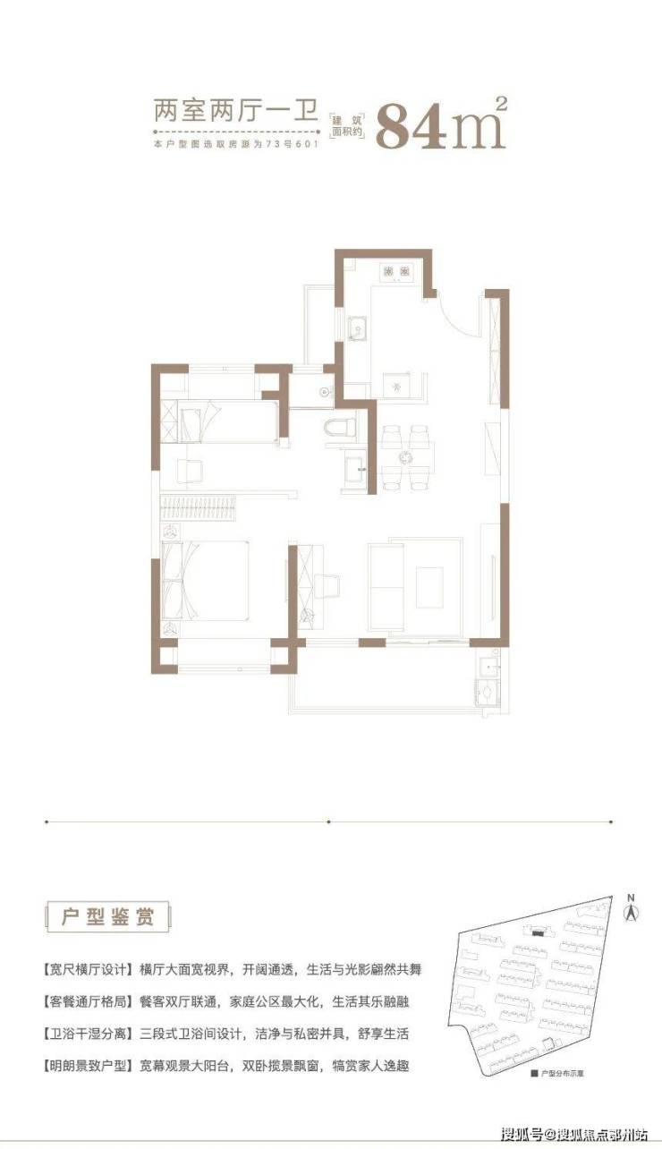 建面约 84㎡2房2厅1卫户型,做到了2+1开间朝南+动静分离+卫生间干湿分离,非常紧凑的2房户型。