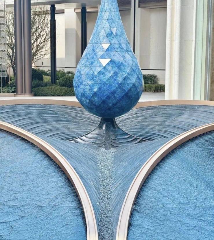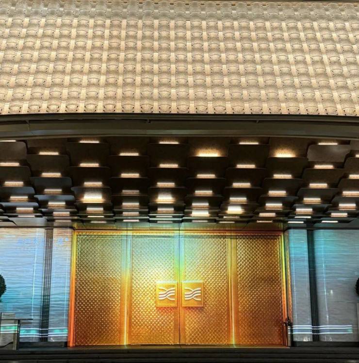你看 社区大门 宽约46米,高约9米,灵感源自“京杭大运河博物馆”设计,顶部大约2280块水晶瓦精心雕琢,内部超300块金鳞铝板手工拼接,还有层叠水景,整个一看就贵气。