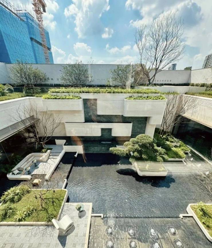 下沉式会所 ,以叠水、卡座、花坛打造立体花园,将豪宅的“隐奢感”拉满。内部配置 板块首个 无界恒温泳池 、健身房、瑜伽室、休闲水吧、社交雅座 等多功能场所。