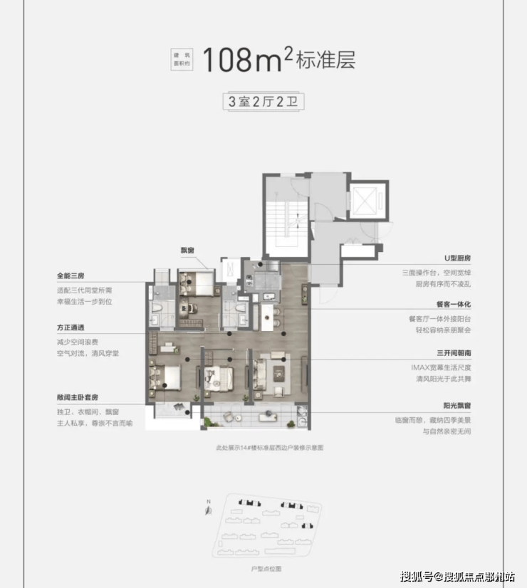 建面约108㎡高层,3室2厅2卫设计,南向客厅宽敞明亮,整个户型动静分离,空间利用率极高。