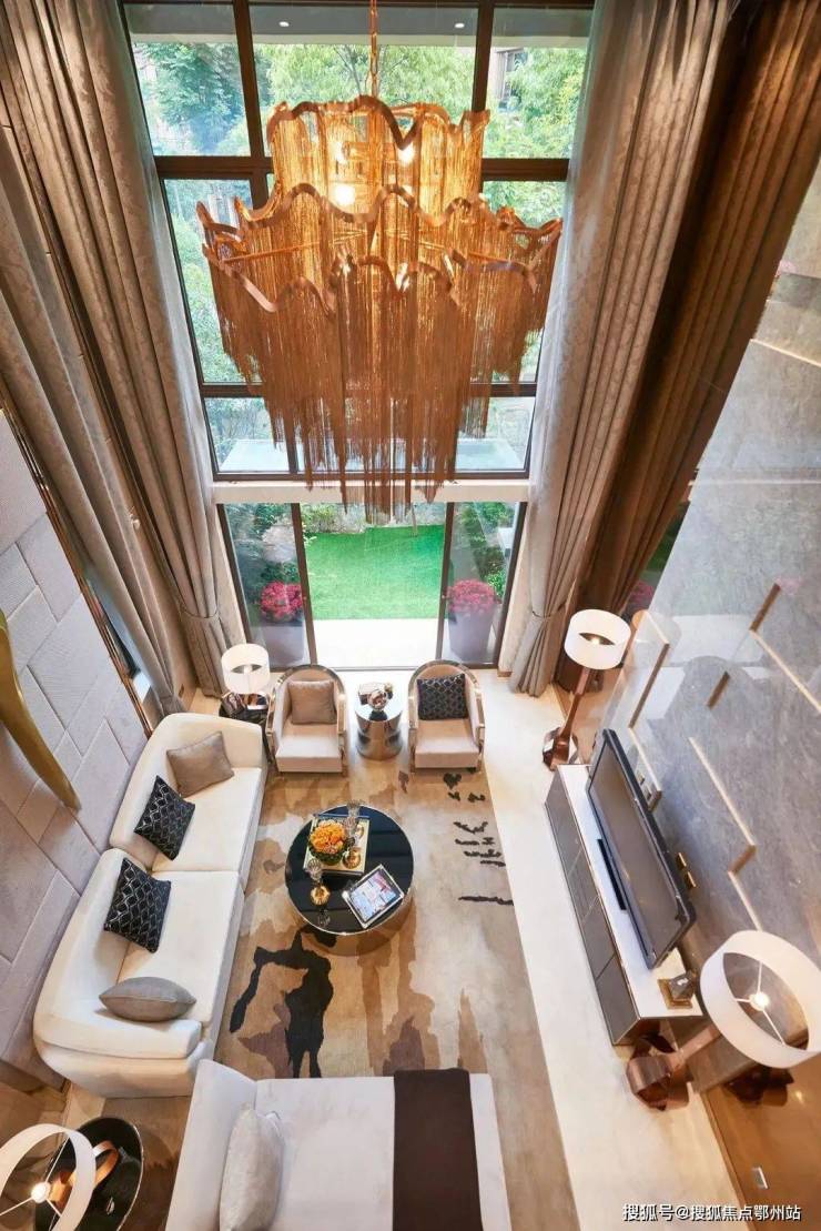 客厅交付时是6米挑高的空间设计, 彰显主人的不凡气度,采光和通风更加通透,空间阔绰大气。