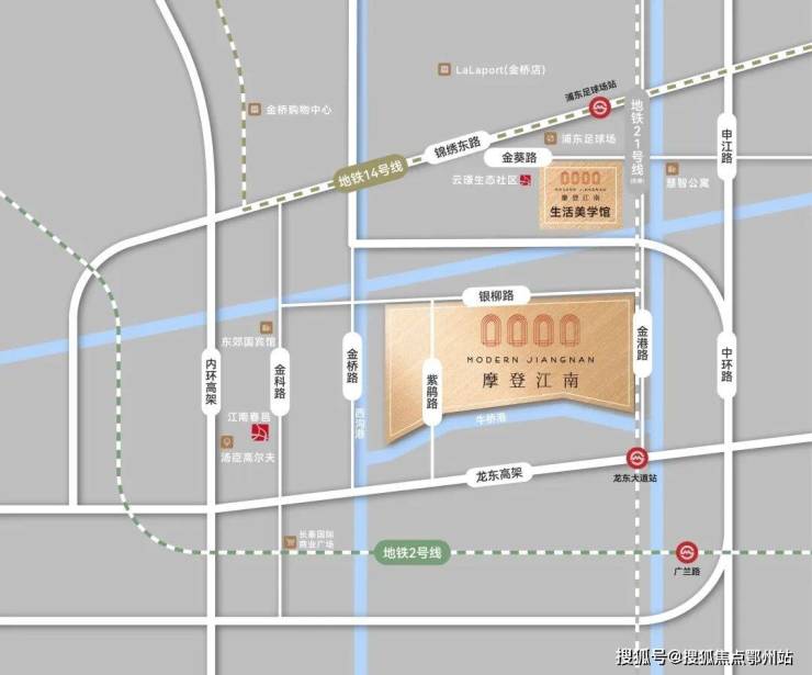 摩登江南落位 浦东内中环,张家浜楔形绿地旁,距离在建中的 轨交21号线龙东大道站仅约400米,周边配套也早已便捷且丰盛。