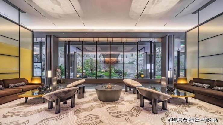 下沉式会所座椅区与室外景观交融,条纹地毯铺设于地,营造多维的体验空间。