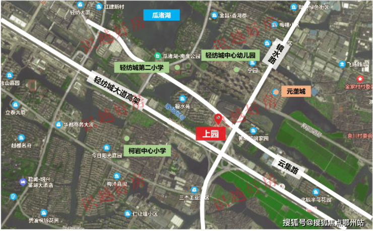 上园位于瓜渚湖板块——柯桥区镜水路与云集路交叉口,近享约 2万方商业综合体 元垄天空MALL(在建 ),轻纺城中心幼儿园、轻纺城第二小学、鲁迅外国语学院等教育资源环伺,居住氛围浓厚。