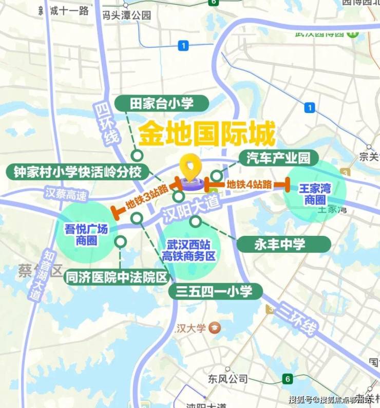 金地国际城位于地铁4号线黄金口站向西200米,楼市划分属于中法生态新城板块,行政划分属于蔡甸区,项目距离三环线约2.2公里,属于三环外。