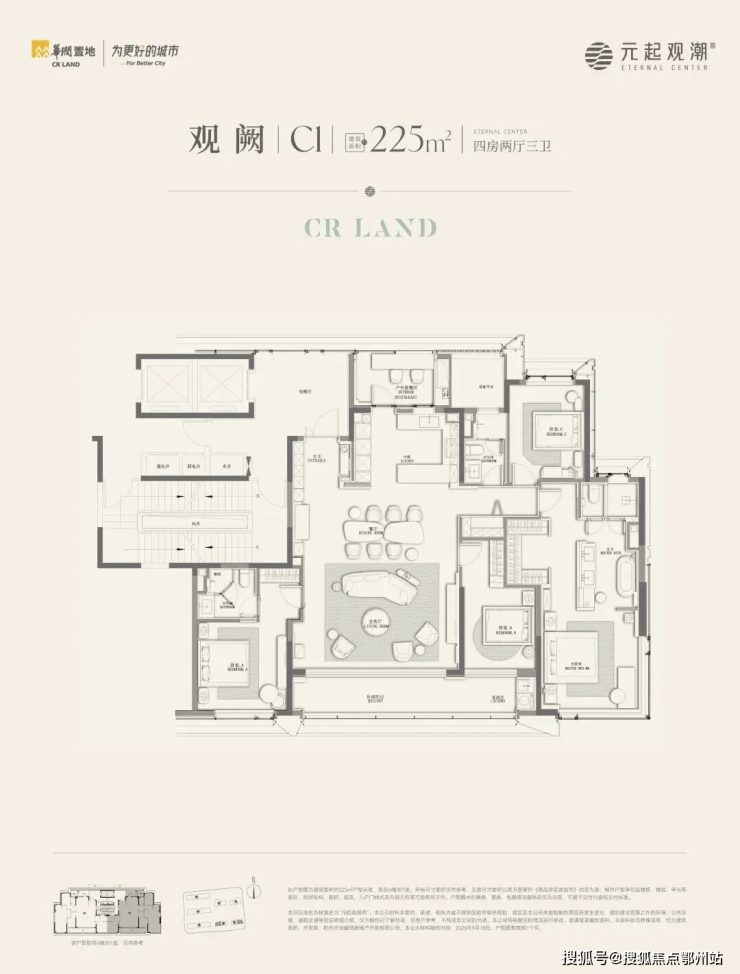 起步约225㎡户型都大宅感十足:同样是两梯两户,这个户型还配备了“ 全明电梯厅”。四房三卫的格局,南向排布三个卧室。其中,主卧不仅自带270°转角窗,还设计了 “洄游式”动线:开放式的梳妆区串联休息区和衣帽间,完成场景的无缝转换。