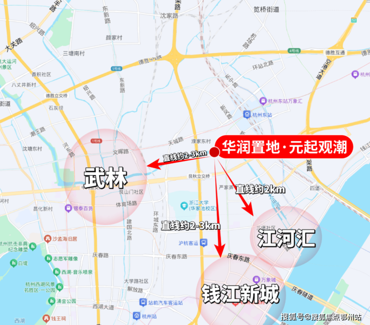 杭州华润置地·元起观潮择址城市精粹之上——上城区安琪儿板块,毗邻杭州第一中心武林和第二中心钱新,北近京杭运河,土地价值高,环境优美,交通便利,是杭州新城核心组成部分。项目所在大区域为城市核心区,周边路网发达,城市界面较好,场地周边已规划幼儿园及小学,配套齐全,地块北侧200M为京杭运河,为场地赋能。