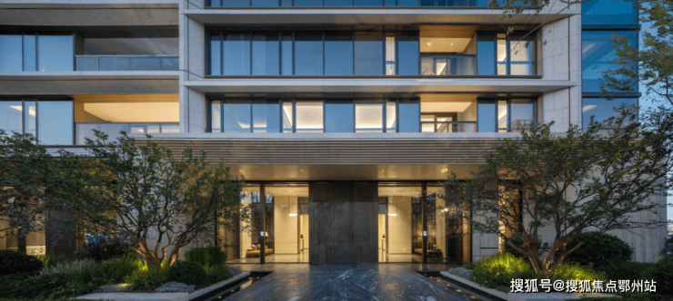 建筑立面上,源自罗伯特・斯特恩古典风格的现代转译,融入蒙迪里安格构手法,以质感石材、鎏金铝板与大面积玻璃的精妙组合,搭配独墅感框景序列,既彰显古典的厚重与尊崇,又兼具现代的简约与通透,成为城市天际线中一道独特的风景。
