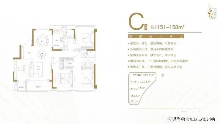 建面约151-158㎡四室两厅两卫户型特点:客餐厅一体化,空间实用,尺度开阔;多功能间设计,满足不同居住需求;全明采光布局,横厅设计,明厨明卫;南向四开间,主生活区域朝南,阳光清风常伴;套房式主卧,主卧带飘窗,独立衣帽卫。