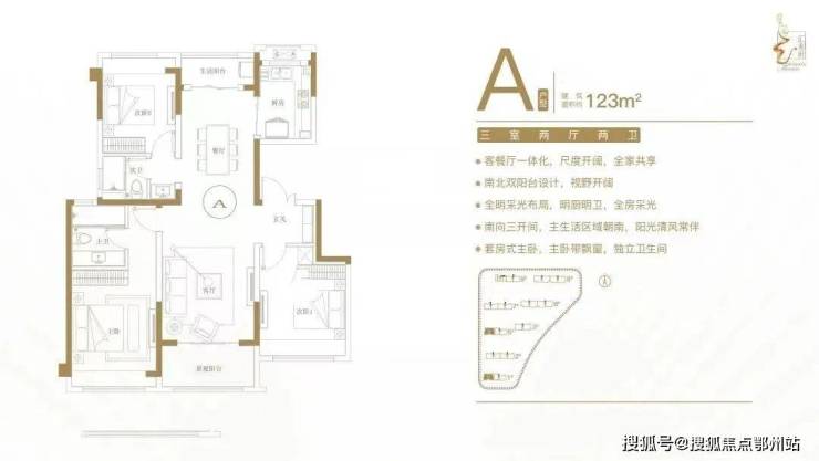 建面约123㎡三室两厅两卫户型特点:客餐厅一体化,尺度开阔,全家共享;南北双阳台设计,视野开阔;全明采光布局,明厨明卫,全房采光;南向三开间,主生活区域朝南,阳光清风常伴;套房式主卧,主卧带飘窗,独立卫生间。