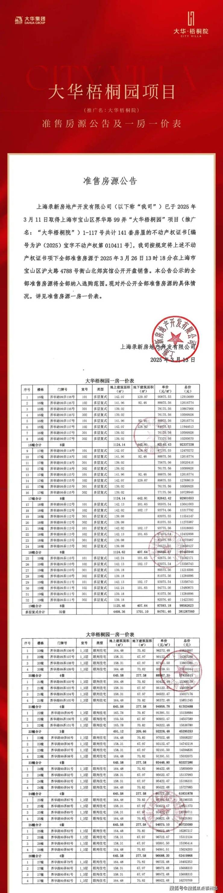 · 长宁中外环待售容积率1.2墅区,联动价16.3万/㎡;