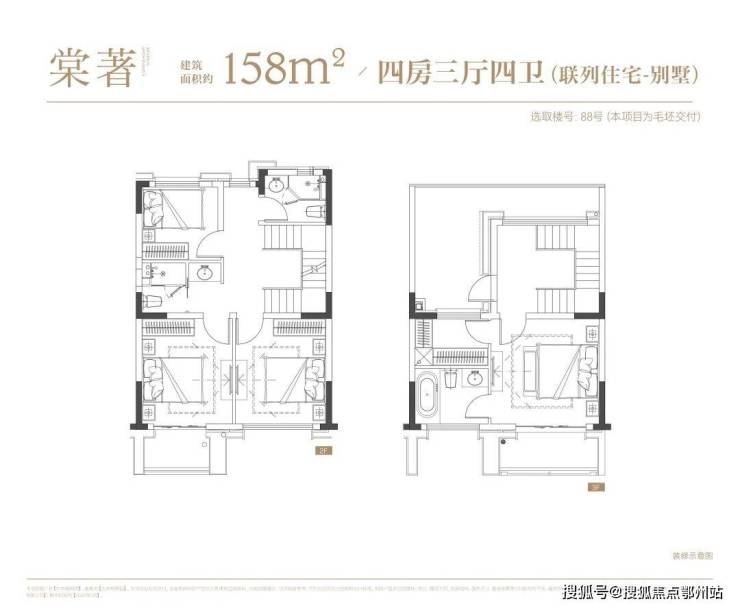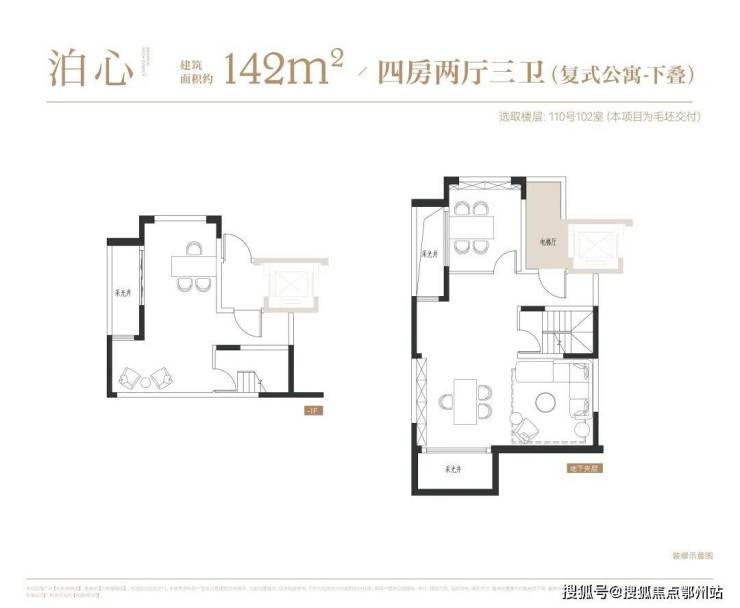 叠墅:叠墅一共四层,分为上/下叠,上叠建筑面积约139㎡,下叠建筑面积约142㎡。