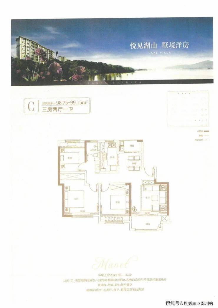 户型解析:99㎡三房两厅一卫设计,三开间朝南,采光良好。