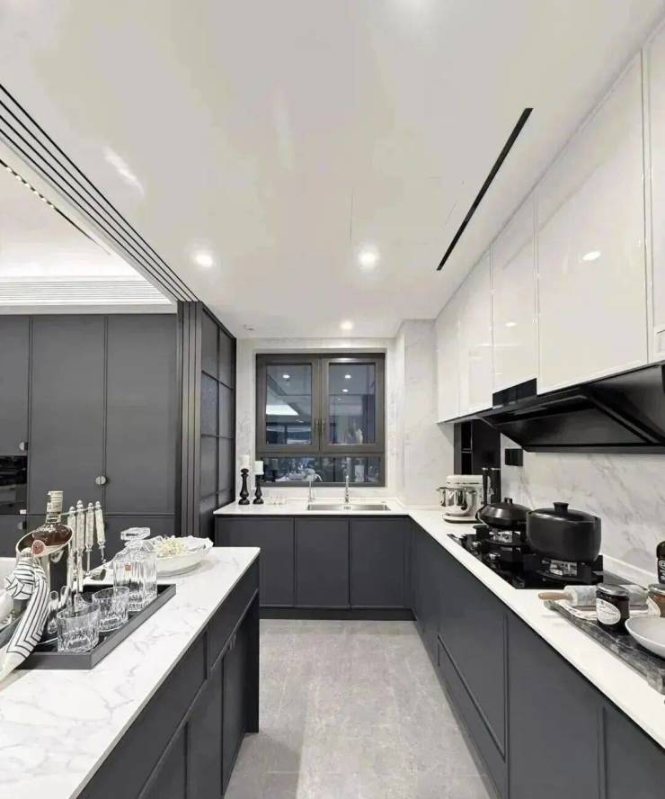 比如,厨房配了珍珠白吊柜、三组抽屉式拉篮合理搭配,调料架收纳、大容量踢脚抽、清洁用品收纳区,米面粮油、碗碟刀叉都可完美隐身。