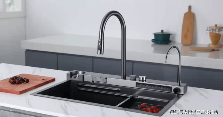 其中,网红多功能水槽设置有 钢琴式按键、精准控温、直饮龙头、洗杯器、瀑布出水、一键排水等功能。
