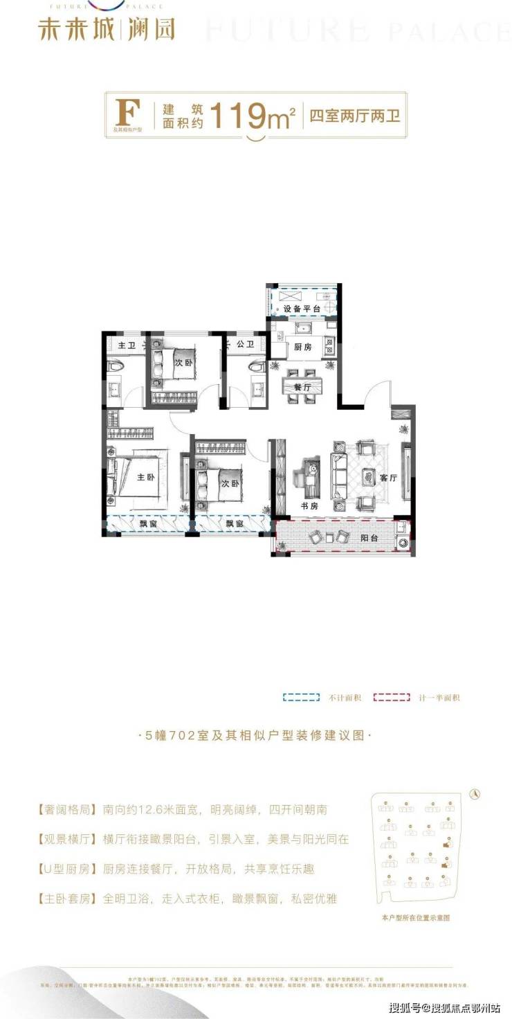建面约119㎡,南向约12.6米面宽, 四开间朝南,整体空间阔绰大气,主卧豪华套房,配备走入式衣柜、全明卫浴、瞰景飘窗,居住尊贵舒适。
