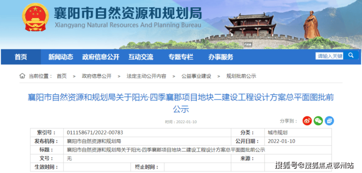 襄阳市自然资源和规划局发布关于 阳光∙四季襄郡项目地块二 建设工程设计方案总平面图的批前公示。