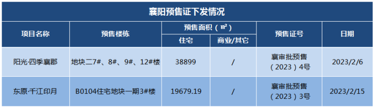 襄阳新增 2张 住宅预售许可证,分别为东津新区 东原·千江印月 项目和襄州区 阳光·四季襄郡 项目,共批得住宅预售面积58578.19㎡,新增房源 约533套 。