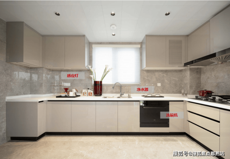 除了正常的三件套(油烟机、燃气灶、洗碗机),还加配了净水器、感应灯!台盆下的橱柜里还预留了插座,方便业主以后安装垃圾处理器。