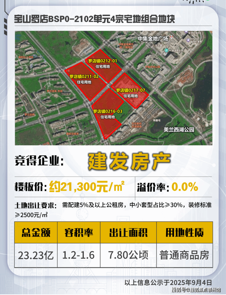 25年上海第七批次土拍中,建发以总价27047万元摘得宝山区BSP0-2102单元0211-02、0212-01、0216-03、0217-07地块地块,楼板价15505元/㎡,装修标准2000元/㎡。
