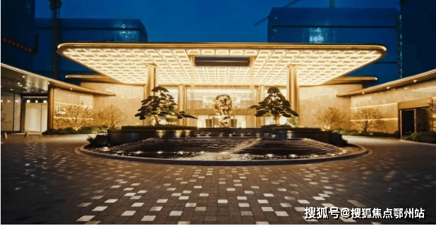 建筑融合东方官帽元素与现代简约风格,铝板+石材外立面