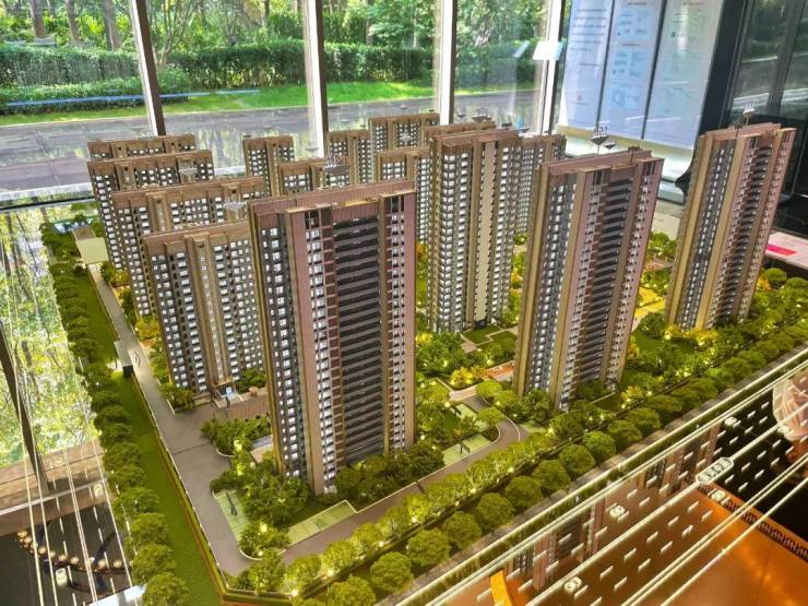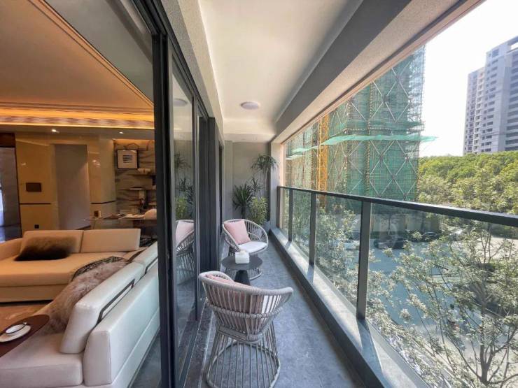 从示范区中可以看到, 部分楼栋外立面已经有提前展现,窗墙比非常大,阳台的观景体验会很好,外立面也是融合了高级灰、蓝、金等色调,看着比较精致。