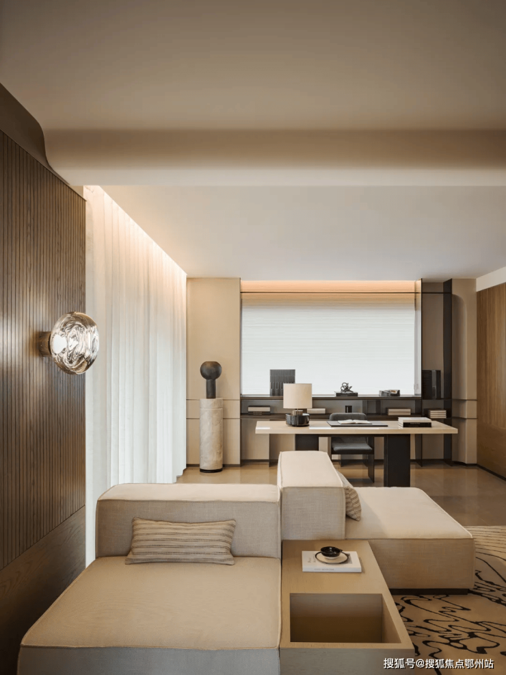 细密精致线条的木饰面与高贵石材结合奠定了经典纯粹的美感。所有休憩空间全部采用无主灯设计,柔和布光,且从公区到衣帽间,至卧榻一步步光影由明转暗,逐步带来放松的感受。