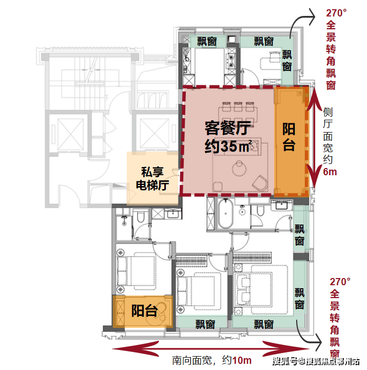 户型设计全屋飘窗与大尺度阳台,采光度全面提升,空间感倍增。