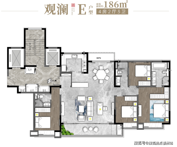 主力户型为建面约138-186㎡的4居室,具体如下: