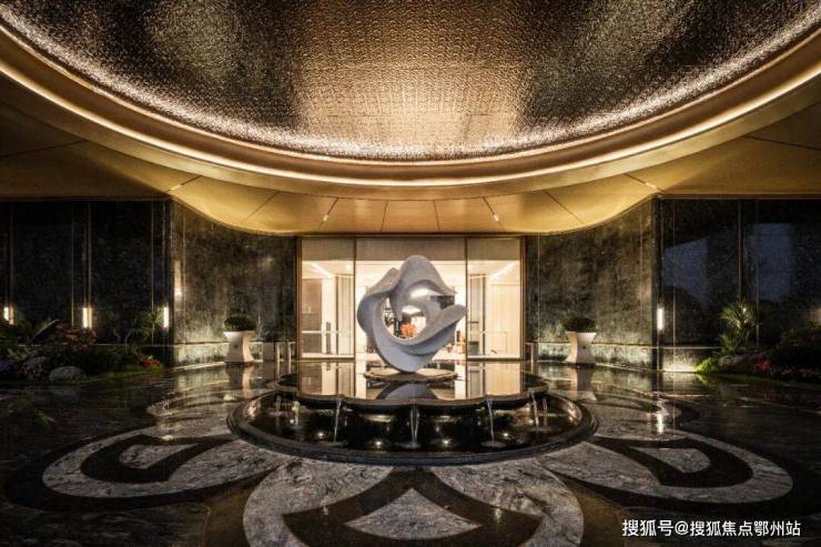 最具仪式感的应该是 大门入口处:宽约35米、高约6.5米的寰宇云厅,如殿堂一般气势恢宏,两侧还有挪威蓝翡翠石材景墙对仗而立。