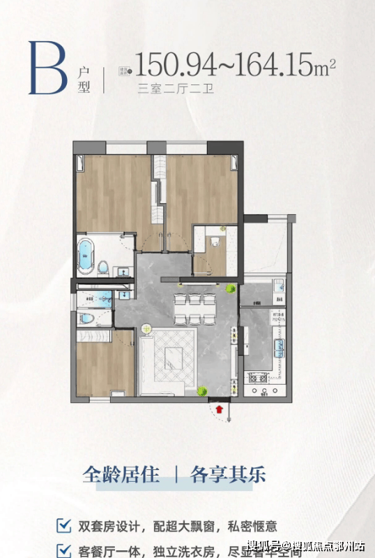 户型设计:主力户型为建面 81-164㎡的精装现房,得房率较高。户型多为南北通透的全明设计,部分户型有 270 度环幕视野,主卧套房配备独立卫浴和步入式衣帽间,U 型厨房采用西门子厨电,部分户型通燃气。