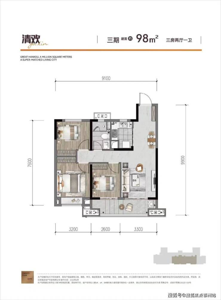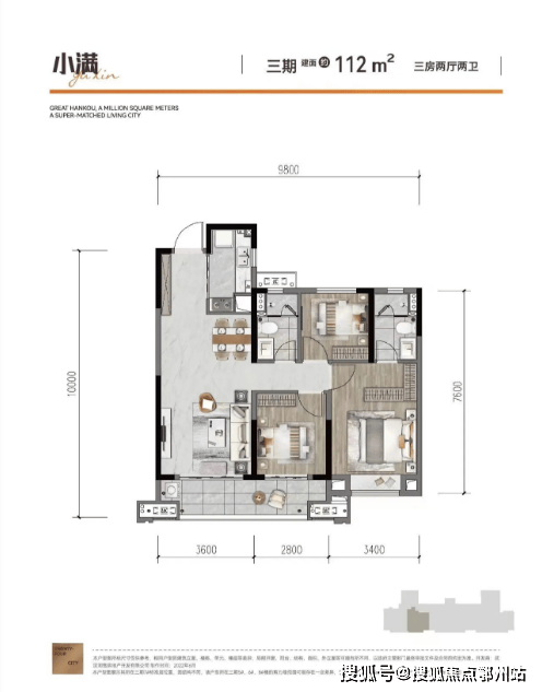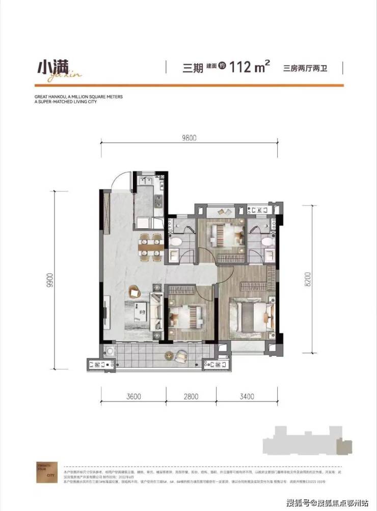 建面约112㎡,三房两厅两卫:边户,三开间朝南,空间布局与112平中间户类似,不过南北通透,舒适度要高,北侧卧室多了一个飘窗。