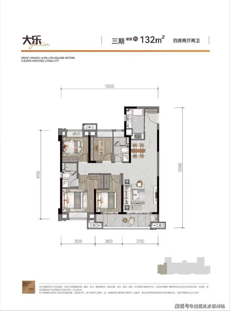 建面约140㎡,四房两厅两卫:边户,这个户型跟上面建面约132㎡户型结构差不多,厨房和餐厅的布局略有差异,面积更大一些。